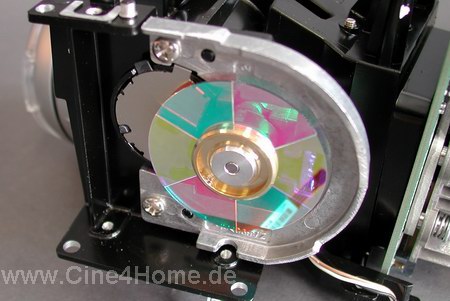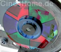 Es handelt sich hierbei um ein Sechssegment (RGBRGB) Farbrad. Auffällig ist die Tatsache, dass alle Segmente gleich groß sind. Dies lässt nicht auf ein Farbtemperatur-optimiertes Rad schließen, da hier normalerweise die Rotsegmente deutlich vergrößert sind. Anscheinend hat Sharp diesmal den Schwerpunkt auf Maximalhellligkeit gesetzt denn auf D65-Farbtemperatur, im Bildtest werden wir dies untersuchen.