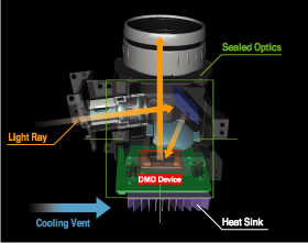 Die Lösung ist verblüffend ähnlich zu der des Infocus IN76: Das Licht wird von schräg unten durch eine Linse auf den DMD geworfen und nach der Bilderzeugung knapp über die Linse, die hierfür extra eine ausgesparte Ecke aufweist, in die Optik reflektiert.