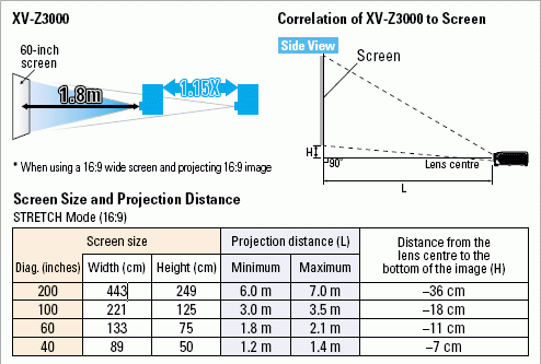 Bei den Aufstellungseigenschaften haben die Sharp-Ingenieure ganz klar "normale" Wohnzimmer im Visier gehabt und den XV-Z3000 dementsprechend optimiert. Wie bei unserem technischen Überblick bereits erläutert, wurde der vertikale Offset durch eine geschickte Konstruktion des Lichtweges sehr gut auf ein sinnvolles Maß reduziert. Gleichzeitig sorgt eine neue Short-Throw Optik für große Bildbreiten aus geringen Projektionsabständen.