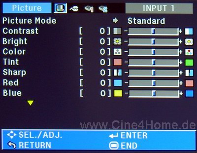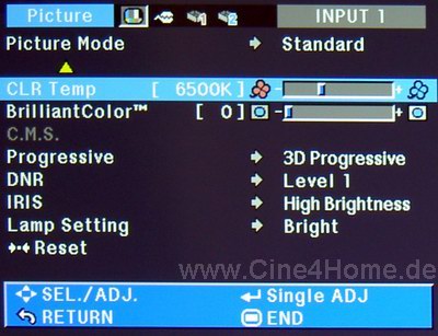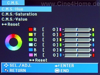 Zunächst fällt auf, dass nach Sharp-Tradition auf getrennte RGB-Kontrast- und Helligkeitsregler verzichtet wurde. Man findet lediglich pauschale Rot und Blau- Optionen, schon Grün wird nicht mehr geboten. Dies bedeutet, dass der Projektor vom Anwender nicht hochpräzise in der Farbtemperatur geregelt werden kann. Abhilfe schaffen kann nur eine gute Werkseinstellung der "CLR-Temp" Funktion (hier kann direkt in Kelvin die Farbtemperatur ausgewählt werden), ihre Genauigkeit werden wir im Bildtest untersuchen. Sehr positiv überrascht waren wir von dem "CMS" (Color Management System) Menü des Z3000, in sehr vorbildlicher Weise lassen sich hier alle Primär- und Sekundärfarben und damit der Farbraum des Projektors beeinflussen.