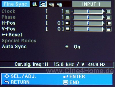 Die zweite Hauptrubrik "Fine Sync" beinhaltet die üblichen Funktionen zur Signalanpassung, wie "Clock", "Phase" und "Position". Diese Funktionen sind alle selbsterklärend, genauere Erläuterungen sind daher an dieser Stelle nicht notwendig.