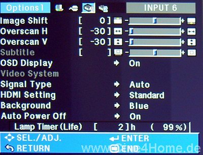 In der dritten, mit "Options1" etwas nichtssagend umschriebenen, Rubrik wurden weitere Funktionen zur Bildlage und Geometrie untergebracht. Interessant ist die Funktion "Image Shift", die dank des 768-er Chips 48 Pixel digitalen Lensshift ermöglicht. So wird der Projektor in seiner Aufstellung noch flexibler, in Verbindung mit dem geringen Offset ist er hier sehr vorbildlich. Ebenfalls dazu gelernt hat Sharp in Sachen Overscan: Waren bislang Sharp-Projektoren nicht selten Overscan-geplagt, so hat der Hersteller diesmal reagiert und gleich einen in vertikaler und horizontaler Richtung getrennt einstellbaren Overscan integriert. Wir werden im Bildetst untersuchen, wie gut er funktioniert. Die letzte erwähnenswerte Funktion des Option1-Menüs ist "HDMI-Setting", mit der festgelegt werden kann, ob digitale PC- oder Videosignale anliegen. Auch dies ist eine Verbesserung gegenüber Vorgängermodellen, die diese Option so noch nicht aufwiesen.