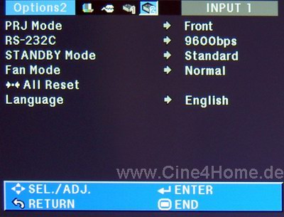 In der letzten "Options2"-Rubrik befinden sich letztendlich die am seltensten gebrauchten Funktionen. Neben Projektionsmodus (Front, Decke etc.) kann hier die gewünschte Sprache sowie die Geschwindigkeit der seriellen Schnittstelle bestimmt werden. Auch ein Gesamtreset ist möglich, um den Projektor in seinen Ursprungszustand (bis auf den Lampenzähler) zurückzuversetzen.