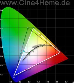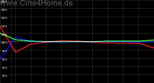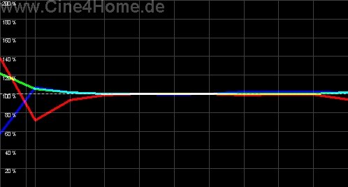 Zu bemängeln sind dennoch eine 20% Abweichung von Rot in dunklen Bereichen und in Weiß. Ersteres ist leider ein typischer Mangel bei vielen Projektoren, der sich oft nicht korrigieren lässt, Letzteres ist auf einen Kompromiss zugunsten der Helligkeit und des Kontrastes zurückzuführen: Der Projektor ist ab Werk auf "mehr Weiß" eingestellt, als die UHP-Lampe bei richtiger Farbtemperatur halten kann. Da Rot grundsätzlich die limitierende Farbe ist, ergibt sich ein gewisser Rotmangel, der helle Bereiche nah bei Weiß künstlich kühl wirken lässt. Dieses Defizit lässt sich aber durch ein wenig Logik auch vom Nichtexperten schnell verbessern: Wenn der Projektor ein wenig zu hell eingestellt ist, so müsste es reichen, ein wenig dieser Helligkeit mit dem "Kontrast"-Regler (dient zur Justage des Weißpegels) zu reduzieren. Und siehe da, ein paar Punkte nach unten geregelt, schon ist so gut wie keine Abweichung von der Videonorm mehr zu erkennen.