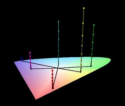 Unsere 3D-Ansicht des Farbraumes zeigt, dass die Grundfarben über alle Helligkeiten hinweg perfekt abgestimmt sind und auch in ihren Maximalpegeln der Norm entsprechen. Dementsprechend nichtexistent ist auch die Gefahr der sichtbaren Farbverälschungen: