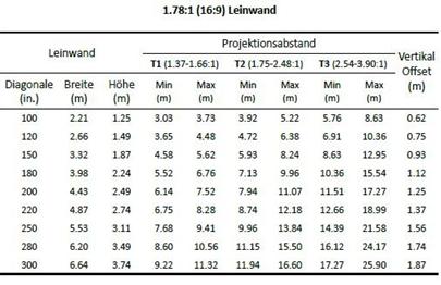 Der Zoombereich des Objektives ist gegenüber der LCOS / LCD Fraktion deutlich geringer, was durch das Angebot dreier verschiedener Objektive ausgeglichen werden soll. Als Nutzer muss man sich also vor dem Kauf und der Installation genau bewusst sein, welches der drei Objektive (T1, T2, T3) man benötigt, obige Tabelle gibt Aufschluss über die jeweiligen Spielräume. Berücksichtigt man dies, so kann der Projektor auf nahezu jede Raumgröße vorkonfiguriert werden.