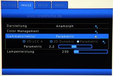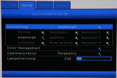 In der zweiten Hauptkategorie „Image“ geht es bereits mehr ins Detail: Neben diversen Bildformaten und der Lampenleistung (230W/280W) stehen hier ein ColorManagement und die Gammakorrektur zur Verfügung: