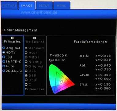Das CMS besteht nicht aus den üblichen RGBCMY Reglern, wie bei vielen anderen Heimkinoprojektoren, sondern ermöglicht es, die Primärfarben direkt mit ihren Zielkoordinaten festzulegen. Dies wird unterstützt durch zahlreiche Presets, die präzise nach Videostandards benannt sind. Auch den Weißpunkt wählt man direkt entsprechend nach Videonorm (in der Regel D65). Wie genau die in diesem Menü angegbenen Werte auch der Messrealität entsprechen, überprüfen wir im Bildteil dieses Tests.