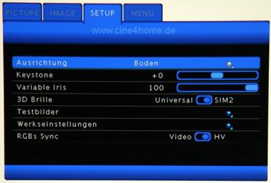 Die dritte Hauptkategorie "Setup" beschäftigt sich vornehmlich mit der Installation des Projektors. Zudem kann hier die Iris verstellt und der 3D-Brillentyp gewählt werden.