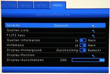 „Last but not least“ verbleibt die Kategorie „Menu“, mit der die Steuerung des Projektors beeinflusst werden kann. Die Funktionen oben sind dabei selbsterklärend.
