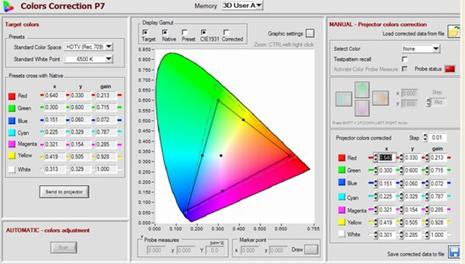 Im Screenshot oben sehen wir, wie komplex das CMS ist und zugleich doch übersichtlich und verständlich in der Bedienung: Für jedes Farbpreset kann man die Koordinaten für alle Primär- und Sekundärfarben manuell eingeben. Mit anderen Worten: Man muss lediglich die Koordinaten der gewünschten Videonorm kennen und eingeben. Wir haben die Koordinatengenauigkeit mit Messsensoren überprüft und stellten fest: Das CMS arbeitet so genau, dass die eingegeben Werte tatsächlich punktgenau der Messpraxis entsprechen. Man kann sich den Messensor also sparen und den Projektor frei mit dem CMS einstellen. Auch in dieser Hinsicht ist uns eine solche Perfektion noch nicht begegnet.