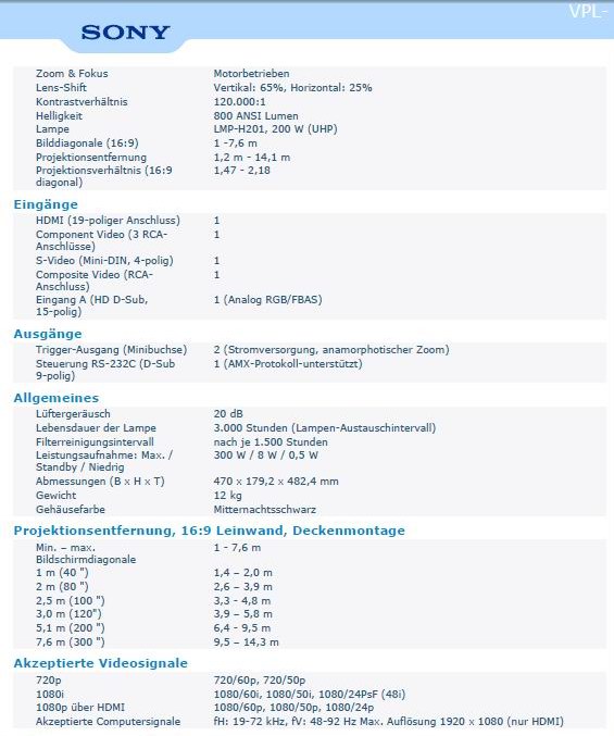 In den Katalogen bewirbt Sony vollmundig ein Kontrastverhältnis von 120,000:1 und eine Lichtleistung von 800 Lumen. Wer ein bisschen Erfahrung mit Herstellerangaben hat, weiß, dass diese stets sehr optimistisch ausgelegt sind und nicht unbedingt unter praxisnahen Bedingungen ermittelt werden. Außerdem wird nicht angegeben, wie hoch der native Kontrastanteil an diesen Werten ausfällt.