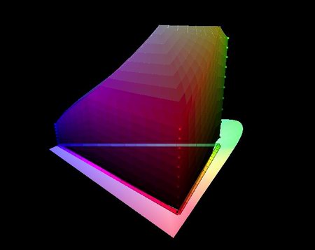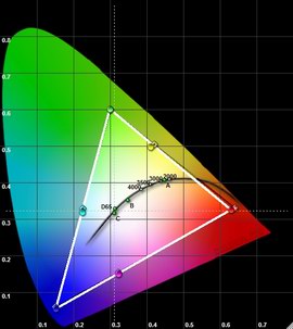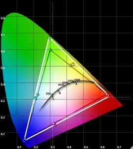 Wie man unserem Messdiagramm entnehmen kann, werden alle Primär- und Sekundärfarben in Farbsättigung und Tönung genau getroffen, ganz ohne aufwändige Nachkalibrierung. Das Diagramm zeigt aber nicht, ob die Helligkeiten der Grundfarben ebenfalls abgestimmt sind, da diese nur in einer dreidimensionalen Abbildung auf der Y-Achse sichtbar werden.