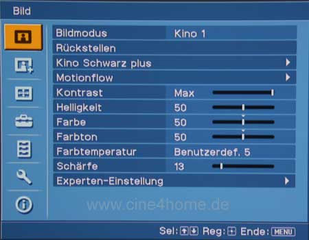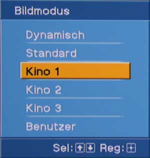 In der ersten Kategorie „Bild“ befinden sich wesentliche Parameter übersichtlich übereinander aufgelistet. Mit " Bildmodus" können dabei verschiedene Werkseinstellungen abgerufen werden (z.B. Kino1).
