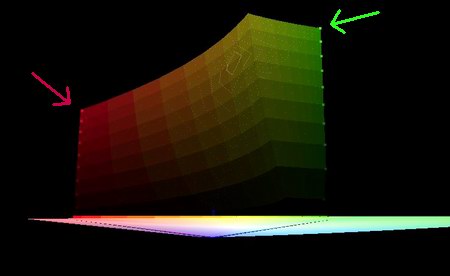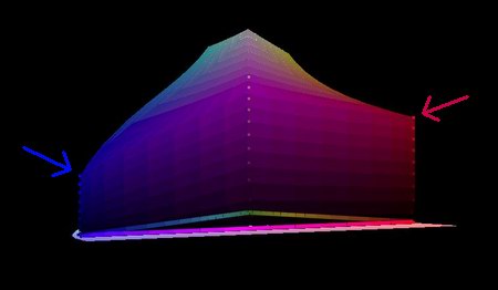 Doch die 3D Ansichten zeigen, dass auch die Helligkeiten der Grundfarben sehr akkurat eingehalten werden: Der Farbraum erreicht genau die Balkenhöhen, wie sie von der HDTV-Videonorm vorgegeben werden.