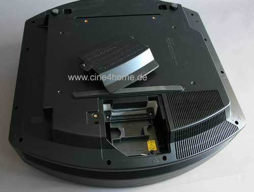 Die Lampe kann bei Bedarf von außen gewechselt werden, der entsprechende Lampenschacht befinden sich auf der Unterseite des Projektors: