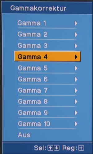 Unter " Gammakorrektur" kann der Anwender zwischen mittlerweile zehn verschiedenen Gammaeinstellungen wählen, sowie die eigene per PC-Software kreierte bei Bedarf abrufen.