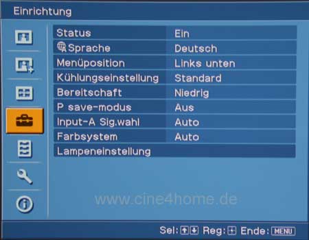 Von Interesse sind hier besonders die Wahl des „Farbsystems“ und die Belegung des „ Inputs A“ (Computer, YUV, Video GBR). Mit " Kühlungseinstellung" kann die Kühlleistung bei hohen Lagen verstärkt werden, " Bereitschaft “ und " Power Save" sind umweltschonende Funktionen zum Stromsparen. Ferner können hier die Sprache ausgewählt und der Lampenzähler zurückgesetzt werden.