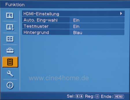"Auto Eing Wahl" bewirkt, dass der Projektor nur auf Eingänge umschaltet, an denen auch ein Signal anliegt. Dies ist eine sinnvolle Funktion, doch wäre sie bei direkten Quell-Tasten auf der Fernbedienung überflüssig. Mit " Testmuster" wird ein praktisches Testbild bei der Zoom & Schärfejustage der Optik automatisch eingeblendet. Die wohl wichtigste Funktion in dieser Kategorie ist die Wahl des richtigen HDMI-Pegels per „HDMI-Einstellung“.