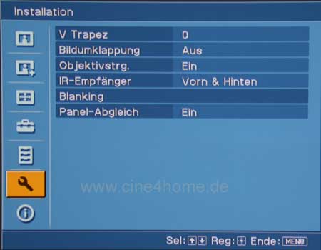 Die letzte Einstell-Rubrik, das Installation-Menü, beinhaltet weitere Funktionen, die auch in die Kategorie "Screen" gepasst hätten.