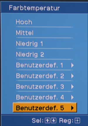 Sehr wichtig für die Farbwiedergabe ist die Funktion " Farbtemperatur": Zwischen vier verschiedenen Werksabstimmungen kann man hier die gewünschte Farbtemperatur aussuchen oder selbst optimieren.