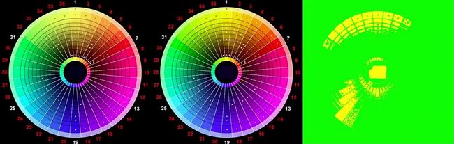 Im der Differenzanalyse rechts kann man die Fababweichungen ablesen, von grün = keine Abweichung bis rot = zu große Abweichung. Sie beweist, dass der VW85 sich in der Farbdarstellung keine Schwächen erlaubt, er verhält sich absolut farbneutral, bis auf die minimalen Abweichungen in Gelb und Blau.