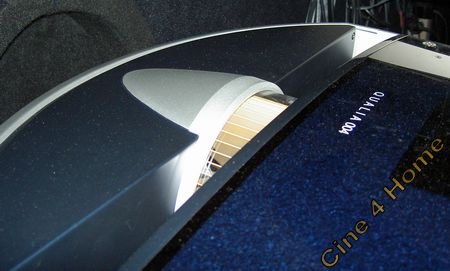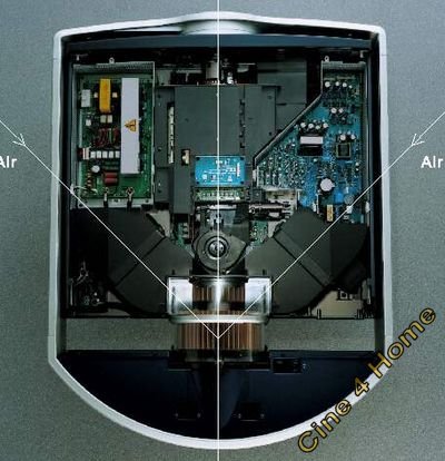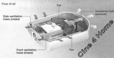 Eine derartige Hochleistungs-Lampe will auch angemessen gekühlt werden: Wie bereits oben erwähnt hat Sony sich auch hier ein spezielles System ausgedacht, dass trotz der notwendig hohen Luftmenge, die bewegt werden muss, die Lautstärke auf ein Minimum reduziert. Vorne und an den Seiten wird die Kühl-Luft angesaugt, bei der Lampe zusammengeführt und direkt an der Rückseite wieder aus dem Gerät herausgeführt.