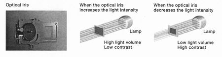 ![]() Die Iris-Blende, zwischen Lampe und erster Kondenser-Linse Sie riegelt somit schon vor dem optischen Block störendes Streulicht ab, ein sicherlich optimaler Lösungsansatz.