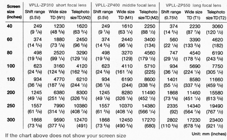 Auch dies zeigt, dass Sony wirklich an alles gedacht hat. Die sich je nach gewählter Optik ergebenden Projektionsabstände im tabellarischen Überblick: In der Installation bietet der Qualia maximalen Komfort: