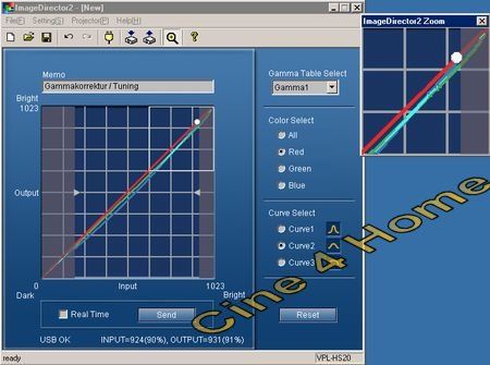 Im Diagramm oben ist lediglich ein deutlicher Grünüberschuss im Bereich von 5 -15% Helligkeit zu erkennen. Doch auch er kann "wegoptimiert" werden, allerdings nicht mit den Standardoptionen, sondern mit der im Lieferumfang enthaltenen speziellen Computer-Software "Image Director", bereits bekannt vom VPL-HS20. Die neueste Version 2.2 lässt sich von der CD schnell auf einem PC oder Notebook installieren, das mit dem Projektor per RS232 oder USB Kabel verbunden wird. Der Helligkeitsverlauf der Grundfarben lässt sich geradezu perfekt grafisch per Maus abgleichen und dauerhaft im Projektor abspeichern.
