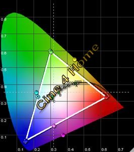 Unsere Farbraummessung zeigt, dass der Projektor alle HDTV-möglichen Farben darstellen kann (weißes Dreieck). Eine solche Präzision ist uns in allen unseren Tests bisher noch nicht begegnet.
