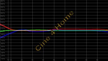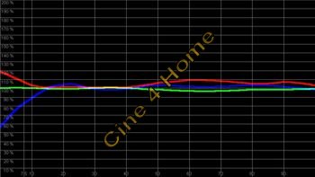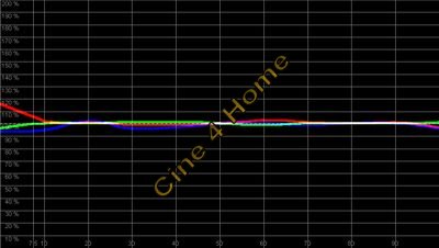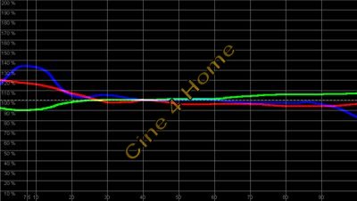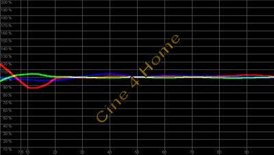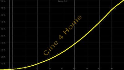 Zwar ist die Kurve gleichmäßig im Anstieg, ohne "Verschlucken" heller oder dunkler Bildinhalte, doch wirkt das Projizierte insgesamt ein wenig zu aufgehellt und verliert so ein wenig an Tiefenwirkung. Dank der Image Director 2 Software kann hier aber der Anwender sehr effektiv nachhelfen. Nach der "Gammakalibrierung" sind Anstiegswerte von 2,2 bis 2,4 zur optimalen Raumanpassung kein Problem. Auch hier ist absolute Perfektion mit ein wenig Geduld möglich, man sollte nur auf den kritischen Bereich der untersten IRE- (Helligkeits-) Level achten, damit sie nicht im Schwarzwert untergehen. Einmal eingestellt, erhalten alle Bilder genau die Helligkeitskomposition, wie sie vom Regisseur beabsichtigt wurde.