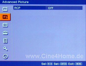 - Advanced Picture Im Advanced Picture Menü wurden die Funktionen zum Real Color Processing / Farbraum untergebracht. Eine eigene Rubrik für eine einzige Bildfunktion halten wir für etwas übertrieben, man hatte die RCP Option ebenfalls im Picture-Menü unterbringen können.