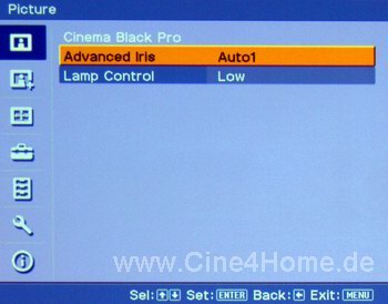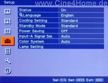 Von Interesse sind hier besonders die Wahl des Color Systems und die Belegung des Inputs A (Computer, YUV, Video GBR). Mit "Cooling Setting" kann die Kühlleistung bei hohen Lagen verstärkt werden, "Standby Mode" und "Power Saving" sind umweltschonende Funktionen zum Stromsparen. Ferner können hier die Sprache ausgewählt und der Lampenzähler zurückgesetzt werden.