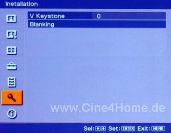 - "Installation"-Menü Die letzte Einstell-Rubrik, das Installation-Menü, beinhaltet weitere Funktionen, die auch in die Kategorie "Screen" gepasst hätten.
