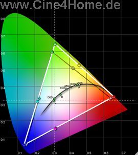 Gerade beschriebener Farbraum des Topaz ist gleichsam der "Farbkasten", mit dem die Farbdarstellung ermöglicht wird. Dazu gehört aber noch die Farbabstimmung, sprich die richtige "Mischung": Erst sie ermöglicht, dass alle Farben auch so auf der Leinwand erscheinen, wie von den Filmemachern beabsichtigt. Der AW15 bietet drei verschiedene Werkspresets der Farbtemperatur, die aber erfahrungsgemäß bei Vorseriengeräten nie den späteren "Farbrikgeräten" entspricht. Daher ist unsere Messung an dieser Stelle noch nicht repräsentativ für das fertige Produkt. Am nächsten an die erforderliche 6500K / D65 Norm unseres Videostandards kam, wie bei Sony fast immer, das "Warm"-Preset. Es ist allerdings noch zu rot- und blaulastig.