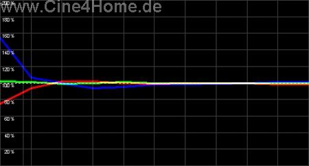 Sehr lobenswert ist auch das verbesserte Grün, das nun nicht mehr ins Gelbe abdriftet wie bei den Vorgängermodellen. Ebenfalls sehr vorbildlich ist die Abstimmung der Sekundärfarbem die nahe bei ihren Sollwerten liegen. Wir halten den leicht vergrößerten Farbraum des Topaz für einen guten Kompromiss zwischen Farbenpracht des Kino-Originals und Farbgenauigkeit in der Videonorm, die von Haus aus leider nur veraltete, schwache Farben vorsieht. Wer es aber videotechnisch absolut "korrekt" haben will, der kann mit Hilfe des RCP-Color Managements den Farbraum selbst anpassen. Mit diesem Menü können gewisse Farbbereiche (Rot, Grün, Blau, Magenta, Gelb, Zyan) ausgewählt und in Sättigung und Farbe leicht verändert werden. Mit Hilfe von Messinstrumenten gelingt es dabei relativ schnell und einfach, den gewünschten Farbraum zu simulieren.