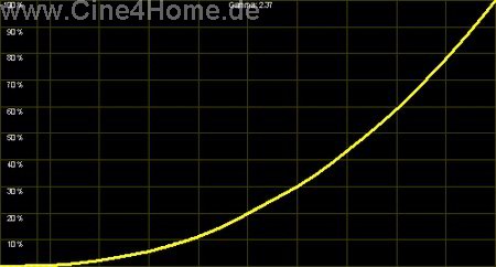 "Gamma 3" Das "Gamma3" Preset zeigt eine deutlich steilere Gammakurve, die mit einem Anstieg von 2,37 für optimiert dunkle Heimkinoräume geeignet ist.
