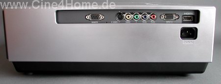 Insgesamt findet sich ein YUV-Komponenten-Eingang (3x Cinch), ein RGB H/V Eingang (Sub-D) und ein digitaler HDMI Eingang mit HDCP Kopierschutzunterstützung sowie für herkömmliche Bildsignale ein Composite- (Cinch) und ein S-Video Eingang (Hosiden) auf der Rückseite des Projektors.