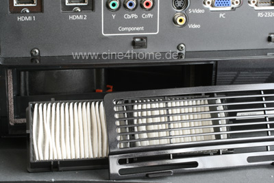Nach Sony-Vorbild wurde ein feineres Filtermatrial in Ziehharmonika-Form ausgewählt, das insgesamt eine wesentlich größere Fläche und einen besseren Staubschutz gewährleistet. Obendrein ist dieser neue Filter nun nicht mehr unpraktisch auf der Unterseite, sondern von der Rückseite aus zu entfernen und zu reinigen. Damit kann der Projektor auch im Falle der Deckenmontage stets bequem gereinigt werden.
