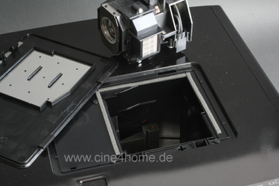 Sie ist eine Eigententwicklung von Epson und zeigt neben der höheren Lichtleistung auch Vorteile in der Installation. Als erste Lampe bietet sie nämlich einen großen Griff zum bequemen Wechsel. Zudem befindet sich der Lampenschacht nun auf der Projektorenoberseite, so dass der Projektor bei einem Lampenwechsel nicht aus seiner Deckenhalterung gelöst werden muss. Von hinten entriegelt man den Deckel des Lampenschachtes, der dann einfach abgenommen werden kann.