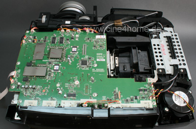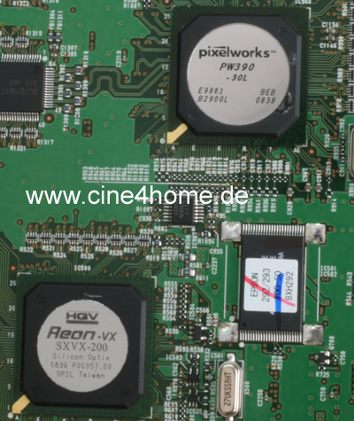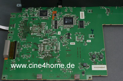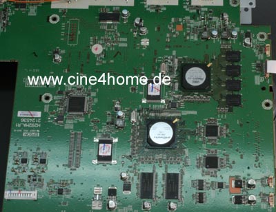 Der 4-4 Pulldown ist aber nicht mit einer Zwischenbildberechnung zu verwechseln! Es werden lediglich die originalen Kinobilder vervielfacht, um mehr Bildruhe zu erzeugen, der Filmlook mit seinen originalen 24 Einzelbildern bleibt erhalten, so wie sich das so mancher Filmfan wünscht. Doch damit nicht genug: Unter der großen Hauptplatine befindet sich eine weiteres Board mit Prozessoren:
