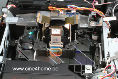 Öffnet man den Lichtweg, zeigt sich der typische Aufbau mit dichroitischen Spiegeln, die das weiße Licht der Lampe in ihre Grundfarben aufspalten und auf die entsprechenden LCDs lenken.