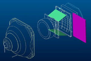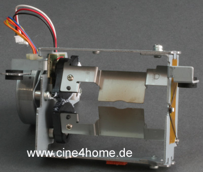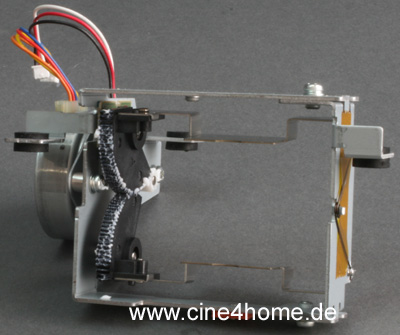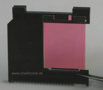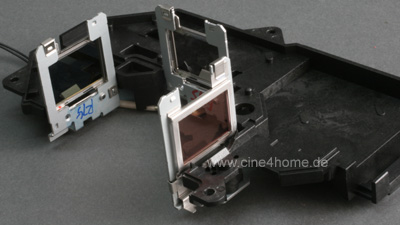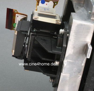 Die D7'-LCDs kann man mitsamt des Glasprismas, das die drei Grundfarbenbilder wieder zu einem gemeinsamen Farbbild vereint, heraus nehmen. Neu sind die Plastikeinfassungen um die einzelnen Panelsegmente: