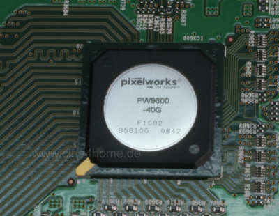Hier finden wir einen weiteren Spezialchip, den Pixelworks PW9800 DNX mit "Motion Engine". Mit ihm wird die neuartige 100Hz Technik mit Zwischenbildberechnung ermöglicht, die die Bewegungsschärfe deutlich steigern soll und Filmmaterial flüssiger aussehen lässt.