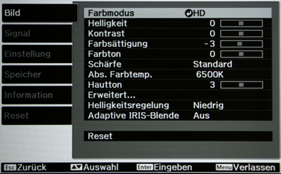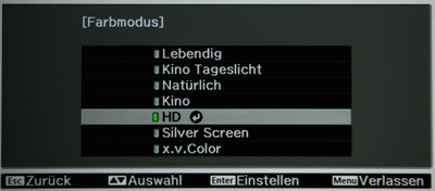 Im "Natürlich"- Modus liefert der Beamer eine Präzision gemäß der Videonorm, wie man sie nur selten zu Gesicht bekommt. Ohne jegliche Kalibrierung erscheinen Farbraum, Farbtemperatur und Gamma genau so, wie es sein soll. Verblüffend ist dabei, dass der Projektor bei Enhaltung der Videonormen dennoch sehr hohe Leistungsdaten beibehält. Mit einem nativen Kontrast von über 5000:1 bietet er eine deutlich höhere Bildplastizität, als viele andere 3LCD-Beamer am Markt. Lediglich in der Lichtleistung kann er in diesem Modus keinen Vorsprung ausbauen, muss sich gegenüber der D-ILA Technik sogar geschlagen geben. Potenzial wurde dabei durch die nicht überarbeitete Mechanik der adaptiven Lichtblende und den sehr starken Cinema-Filter verschenkt, der auf einen sehr großen Farbraum ausgelegt wurde, der allerdings nur im HD-Modus genutzt wird. Hier bieten sich besonders intensive Farben, für die die DVD- und Blu-ray Software leider bislang noch nicht gefertigt ist.