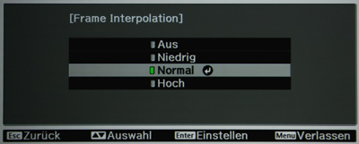 Im Modus "normal" arbeitet die Zwischenbildberechnung wesentlich ausgeglichener. Sie wird nicht so abrupt bei mittelschnellen Bewegungen abgeschaltet, sondern erst bei sehr schnellen. So wird der Bewegungsfluss seltener unterbrochen. Bei sehr schnellen Bewegungen kann es aber zu Detailverlust in Strukturen oder kleinen Bildinhalten kommen. Im Modus "Hi" bleibt die Zwischenbildberechnung fast durchgehend aktiv, auch bei sehr schnellen Bewegungen. Dadurch werden aber Artefakte begünstigt, die immer dann entstehen, wenn die Elektronik nicht genügend Bildinformationen für eine akkurate Zwischenbildberechnung erhält.