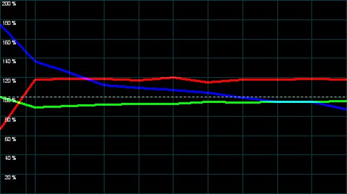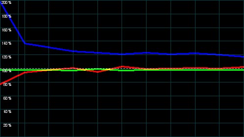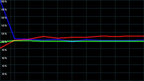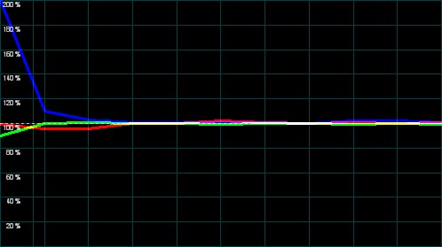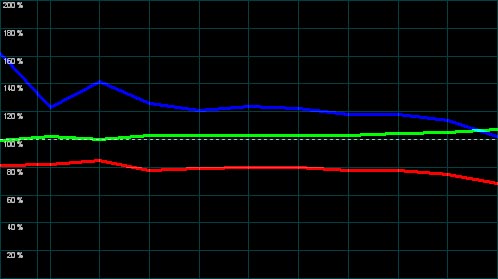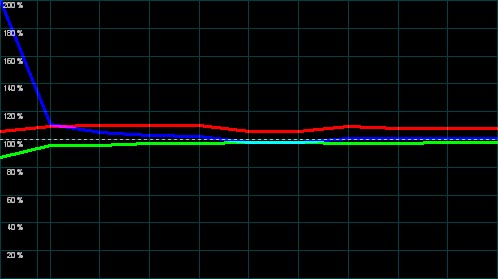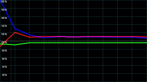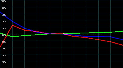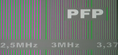 Die Aufgabe wird gut erfüllt, auch im schwierigen Auflösungsbereich um 6MHz tauchen so gut wie keine Interferenzen in der Skalierung auf. Zudem sorgt der geringe Pegelabfall in hohen Auflösungen dafür, dass auch kleinste Details gleich hell erscheinen, wie große. Dadurch wird die Auflösung des Bildes sichtbar gefördert, zumal auch bei reduzierter Schärfeeinstellung kein Pegelabfall zu verzeichnen ist.
