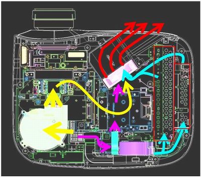 Statt eines zentralen Ansauglüfters wurden in dem neuen Chassis drei separate Luftwege realisert, einer für den Lichtweg, einer für die Lampe und einer für die Elektronik. So erhalten alle Komponenten individuell ihre optimale Kühlleistung. Im Falle des Lichtweges ist dabei ein besonderer Staubschutz wichtig, denn nichts ist störender als bunte Flecken in dunklen Bildern aufgrund von Staub auf den LCD-Panels. Der separate Luftkanal des Lichtweges verfügt aus diesem Grund über einen eigenen Staubfilter, der ebenfalls deutlich verbessert wurde.