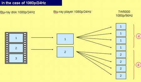 Besonders interessant ist dabei der "4-4 Pulldown", was bedeutet dies? Der 4-4 Pulldown kommt bei 24p-Zuspielungen zum Tragen: Wie vielen Kinofans bekannt sein dürfte, beträgt die originale Kinobildfrequenz gerade einmal 24Hz (Bilder pro Sekunde). Mit diesen 24Hz geht der typische Kinolook (leichtes Ruckeln) einher. Um schnellere Bildumschaltzeiten zu ermöglichen, wurde daher die 4-4 Pulldown Option des HQVs ausgenutzt. Bei dieser Option wird jedes Kinobild nicht nur einmal, sondern gleich viermal dargestellt / wiederholt. Dies ergibt eine Bildfrequenz von 96Hz und dadurch schnellere Umschaltzeiten und mehr Bildruhe.